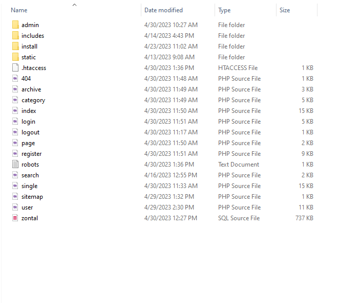 - Unzip the downloaded package and open the /Zontal folder to find all the script files. You will need to upload these files to your hosting web server using FTP or localhost in order to use it on your website.